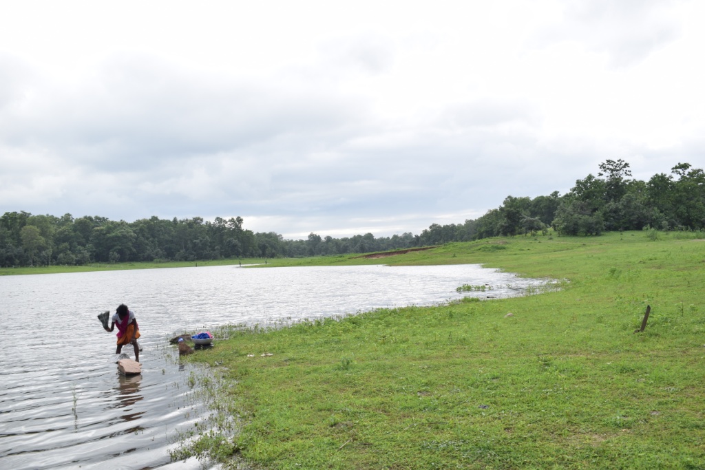 Villager washes clothes, The only water body in Kohka village, Pench National Park, Madhya Pradesh, India